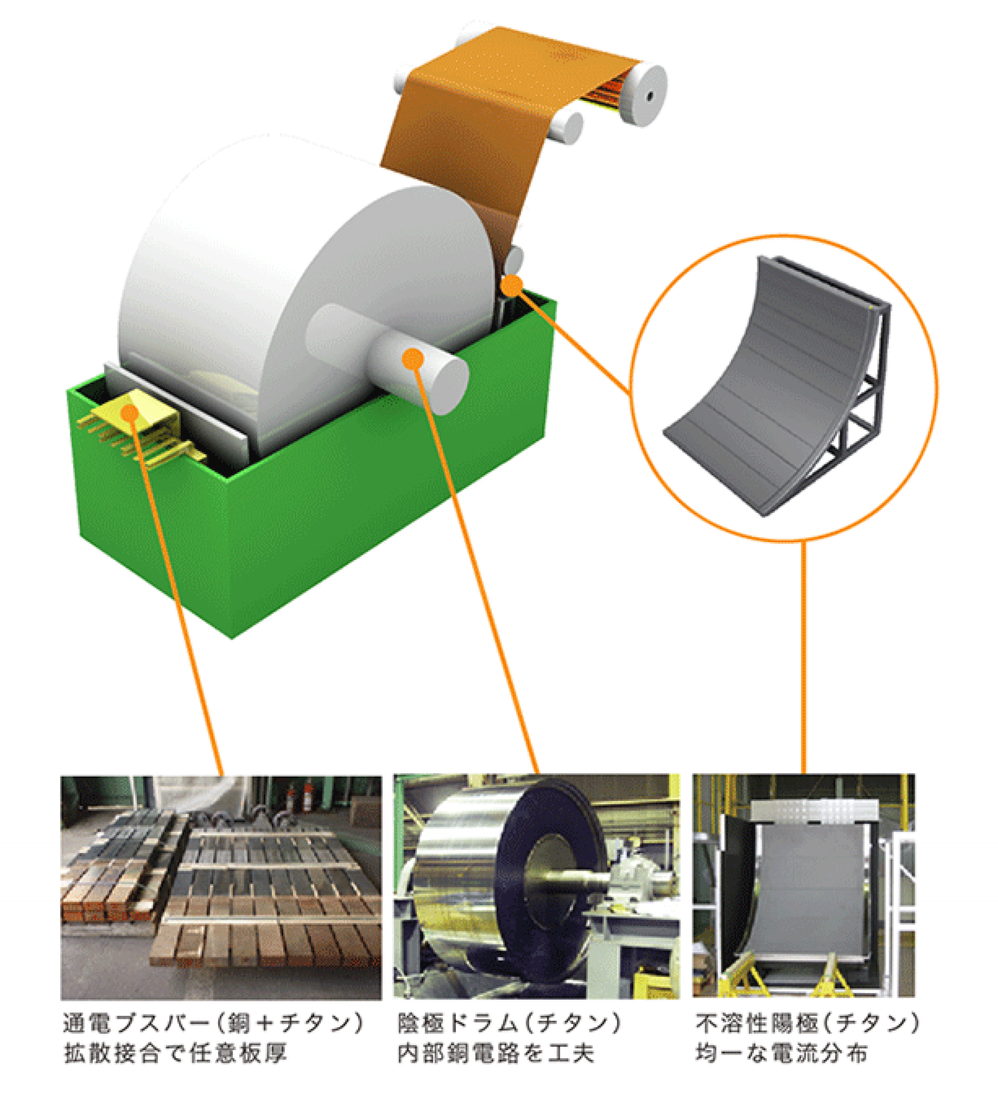 本公司代理日本AKAHOSHI製造的電解銅箔製造設備,包括陰極輥、陽極架台、鈦包銅傳電條。可配合客戶之生產線量身訂作全新產品或提供產品之改造或補修。