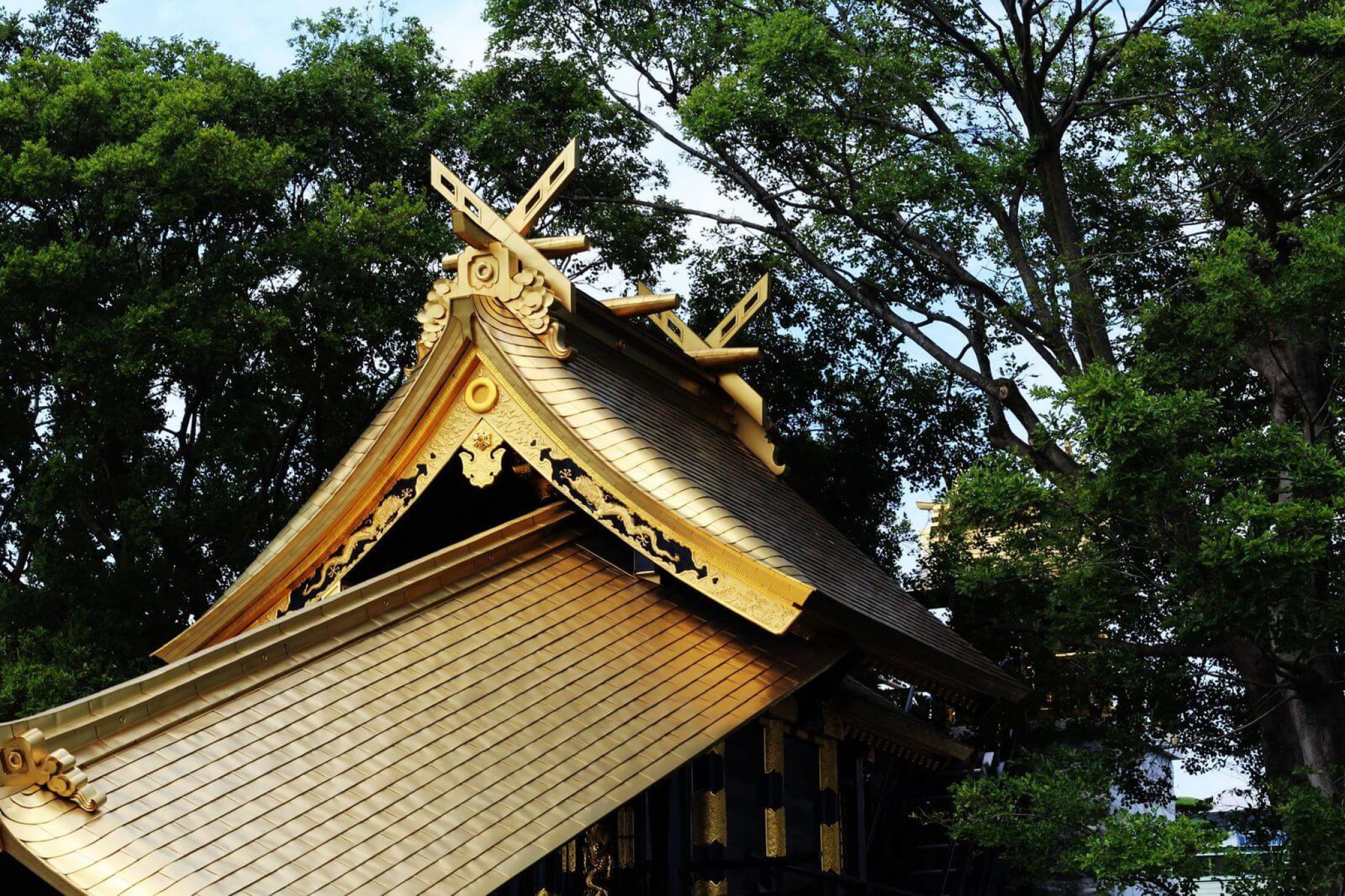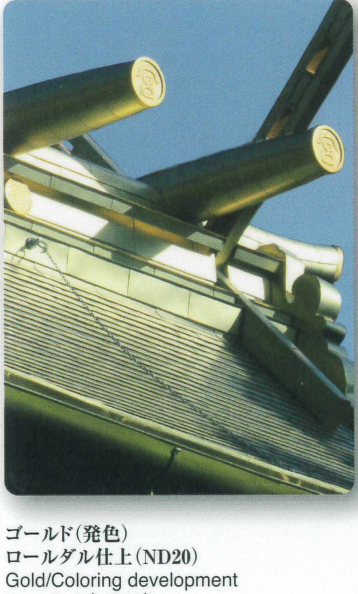 日本NIPPON STEEL除了原有以陽極氧化膜技術製造的金色鈦板之外,還採用新技術開發出離子鍍膜製程製造的高品位金色鈦板。這個新產品採用的離子鍍膜法,是把像真金一樣閃耀的氮化鈦(TiN)離子化,使之帶電並賦予電的吸附力,藉此堅固地塗覆在純鈦板表面。過去,使用金色的內外裝修,是在銅的基底上貼上金箔或使用鎏金法。然而由於粘結層的劣化等的經年變化,貼金箔法需要辛苦的維護和高額成本;而且鎏金法對環境有汞污染的問題,甚至現在已經找不到傳統工匠可以施作鎏金法。採用耐候性優異的離子鍍膜金色鈦板,不但可表現出像真金一樣的光芒,同時也可以大幅減輕維護的負擔和對環境的危害。