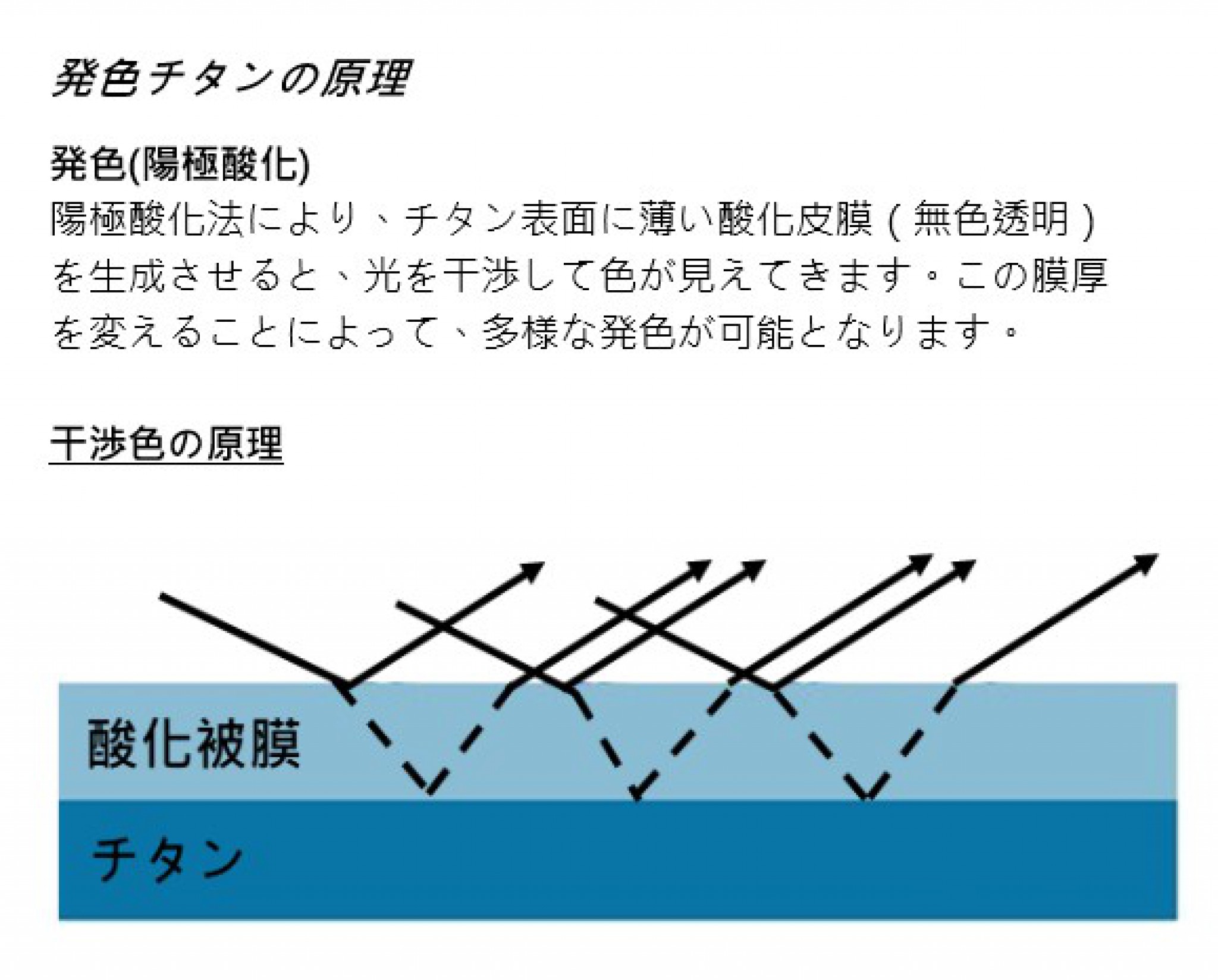 陽極氧化發色的原理是以陽極氧化法在純鈦板的表面形成一層非常薄(無色透明)的氧化膜,利用光的折射原理,使人眼看見折射後的各種顏色。氧化膜的厚度不同,人眼所看見的顏色就不同。氧化膜最薄從0.01μm 開始,以 0.01μm 為增分單位加厚,最厚可以製造到0.15μm,因此純鈦金屬建材的發色可以表現豐富而絢麗的色彩,可以說是夢幻的金屬建材。